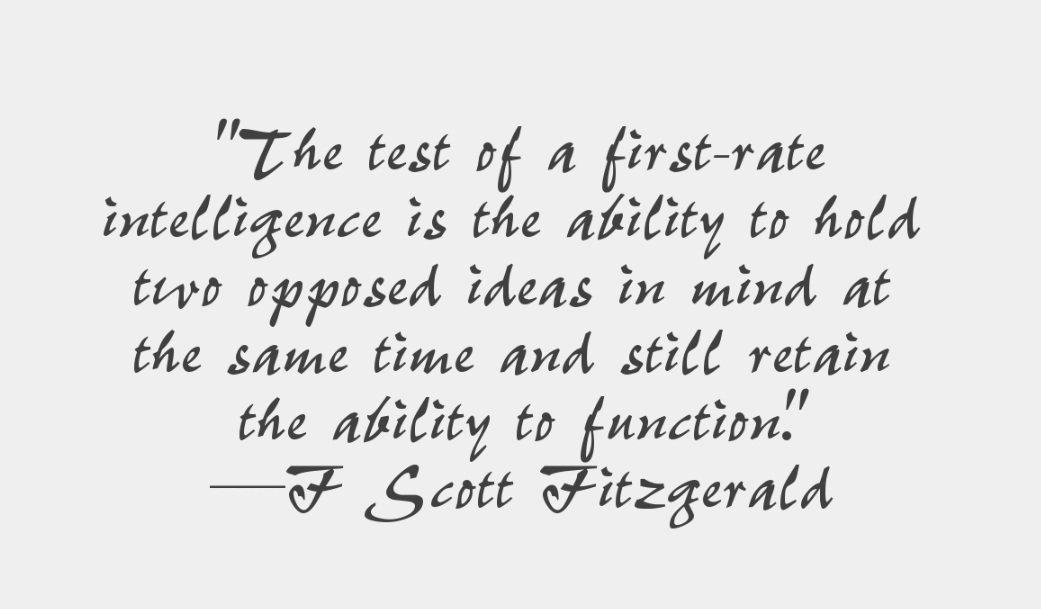 Then she quotes F. Scott Fitzgerald. She says, “The test of a first-rate intelligence is the ability to hold two opposing ideas in mind at the same time and still retain the ability to function.”